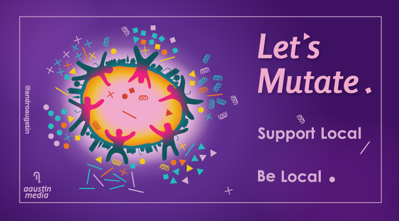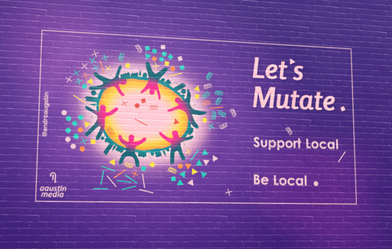 Art created early during the Covid 19 Pandemic (May 2020). I wanted this mural to mark the historic event forever burned into our collective memory. But along with this memory, I want us to look closer. Beyond just a virus, we may see opportunity for cooperation, innovation and change for the better, to mutate. The ultimate message is that we must remeber that we saw survival through supporting locally and drastically adusting our way of life out of necessity. And we must not forget that.